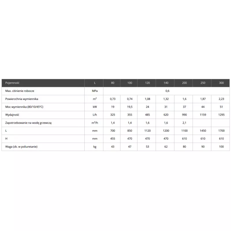 | Objem | L | 80 | 100 | 120 | 140 | 200 | 250 | 300 |
