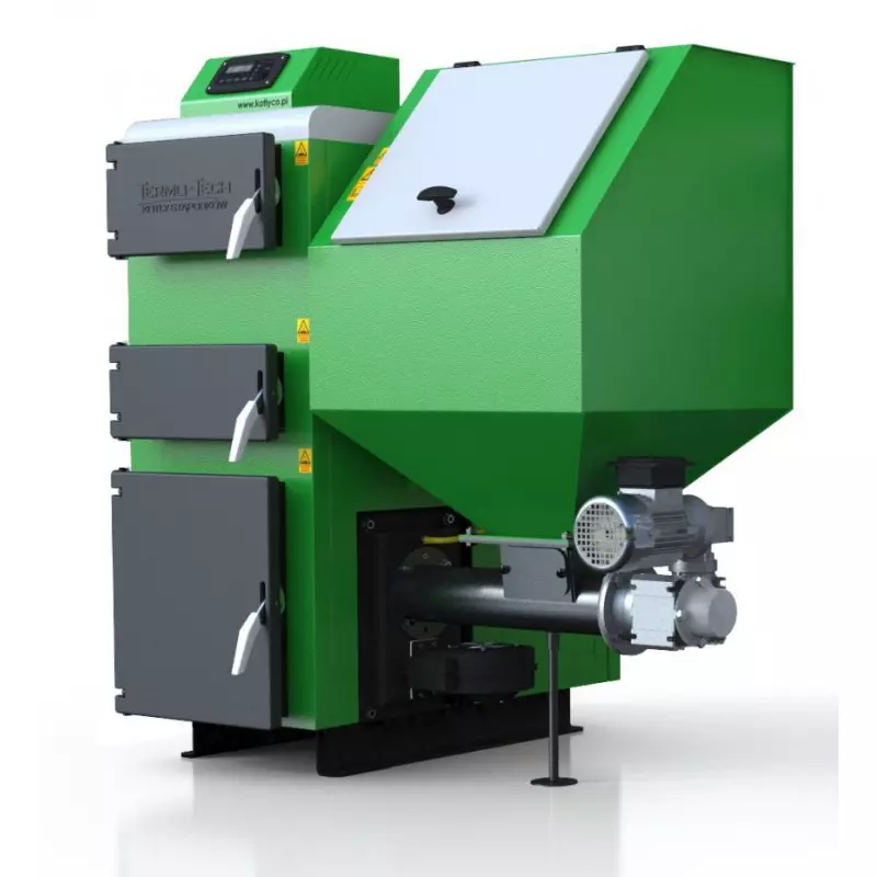 Automatický kotel s litinovým roštem TERMO-TECH TECH DUO to plně automaticky kotel na tuha paliva který splňuje požadavky 5 emisní třídu a v kterém můžete topit uhlím ořech 2 a kusovým dřevem (po namontováni roštu).
