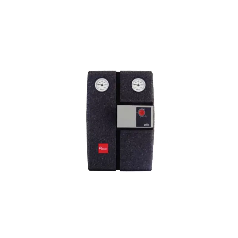 Eine Zweirohr-Pumpengruppe mit einer energiesparenden Umwälzpumpe sowie den grundlegenden Komponenten des Heizsystems, eingebettet in eine kompakte Wärmedämmhaube. Sie ermöglicht den Abschluss des Heizkreislaufs, die Temperaturkontrolle und eine einfache Platzierung der Temperatursensoren. Die Gruppe enthält einen Filter mit Magnet, wodurch sie auch für ältere Systeme mit Stahlrohren geeignet ist.