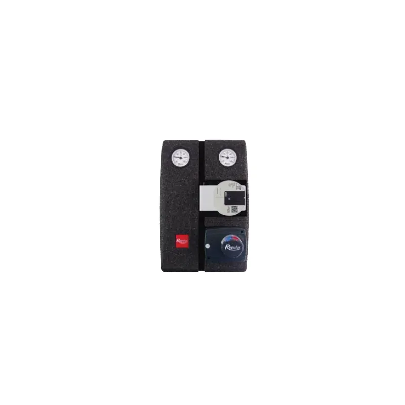 Zweirohr-Pumpengruppe mit einer energieeffizienten Umwälzpumpe, einem Mischventil mit dreistufigem Stellmotor und den grundlegenden Komponenten des Heizsystems, eingebettet in eine kompakte Wärmedämmhaube.