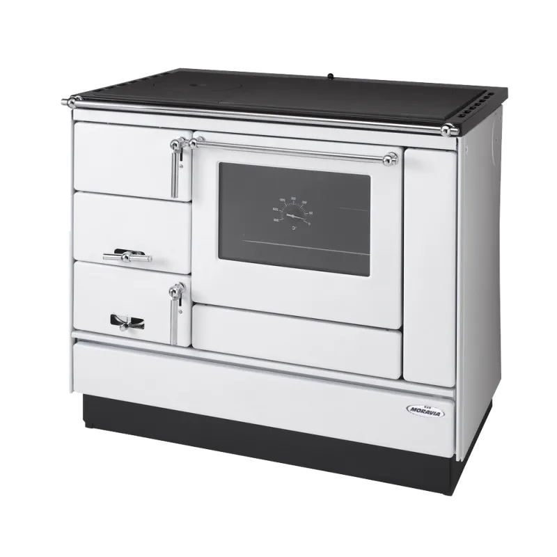 Dieser Herd mit Wassererhitzer (Wärmetauscher) vereint die Vorteile eines Koch- und Backgeräts mit einem Zentralheizungskessel. Die in der Produktion dieses Typs verwendeten Materialien sind ähnlich wie bei anderen KVS MORAVIA Geräten.