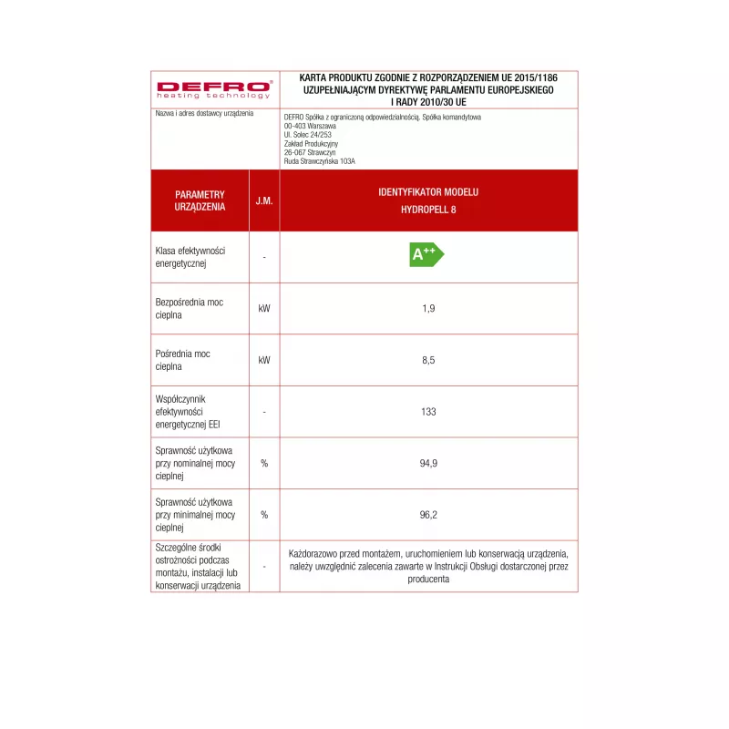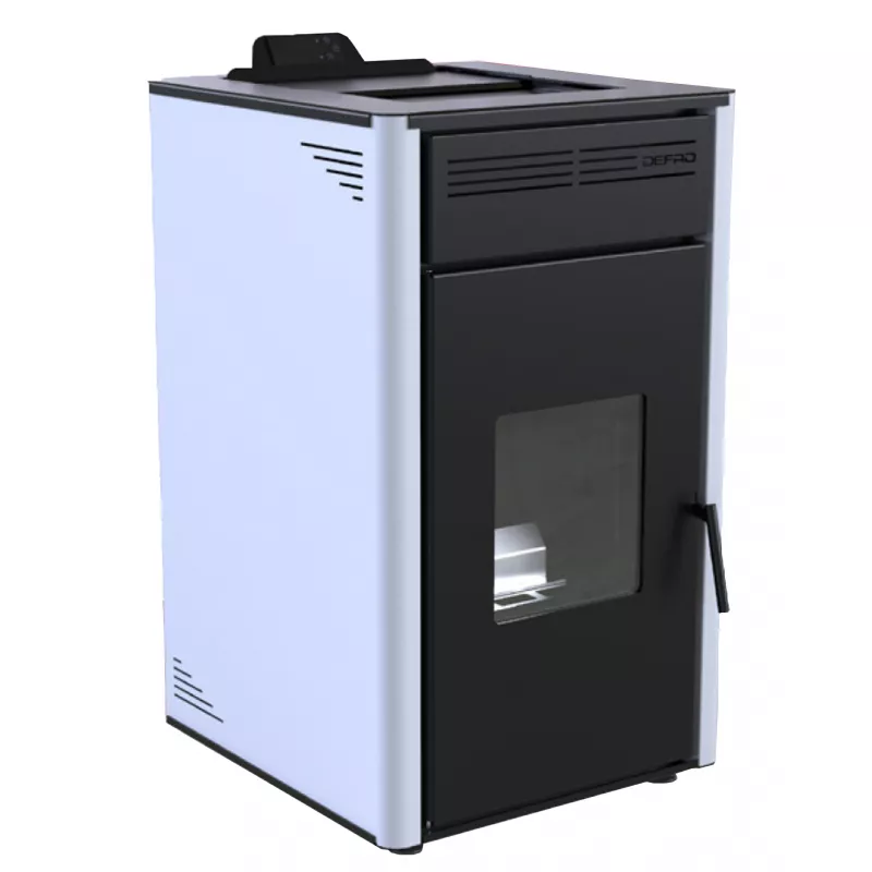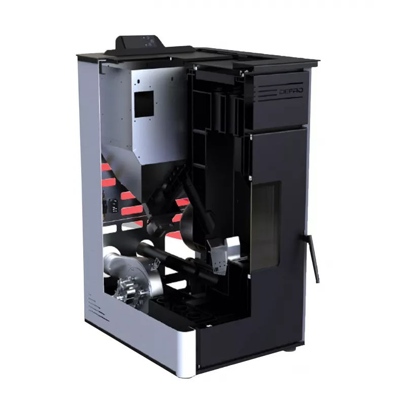 DEFRO HYDROPELL is a pellet fireplace stove. It can be used for space heating and as a hot water source in central heating installations. Works on the principle of emission from fireplace through glass and on the principle of radiation through hot air convection openings.