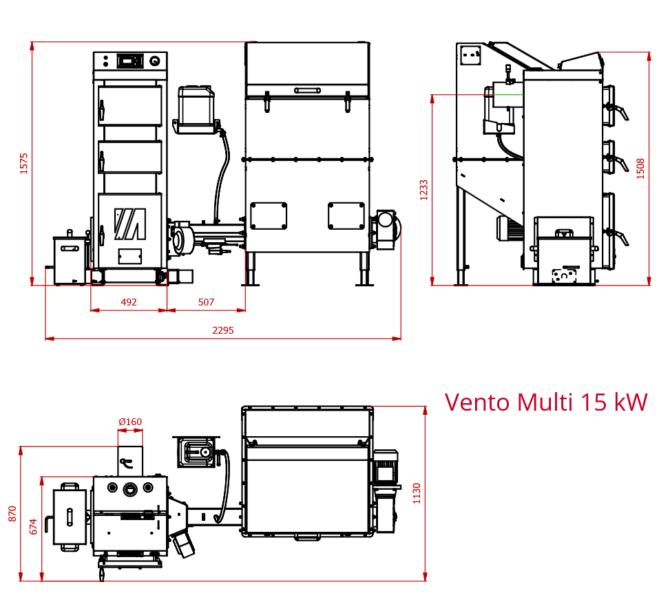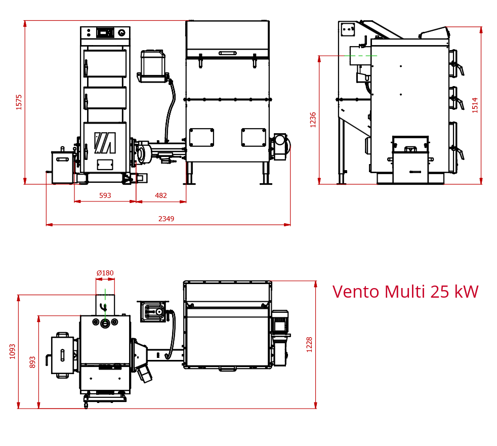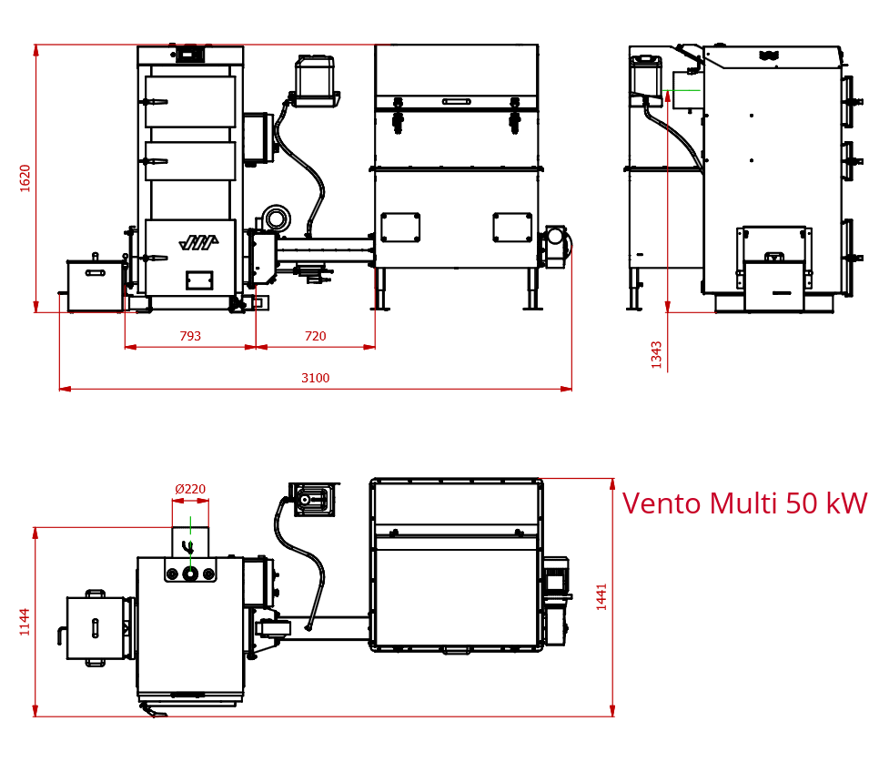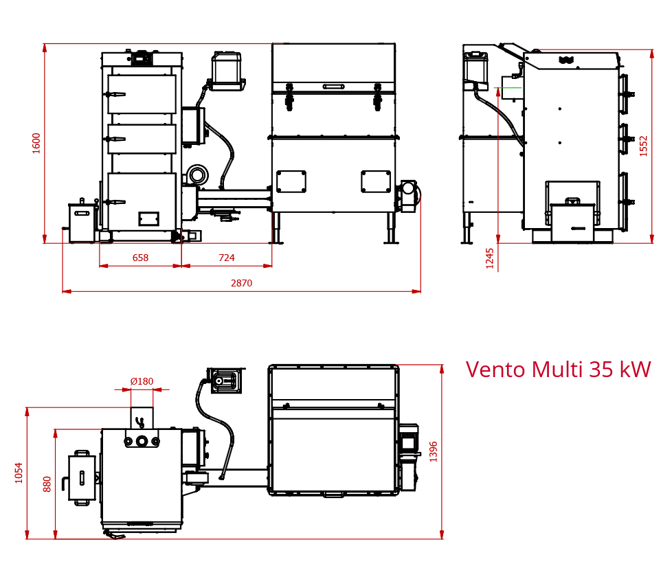 Boiler Multi Vento is a modern and ecological low-temperature water central heating device, designed to burn biomass renewable solid fuel. AZSB set (automated biomass burning set) including a SMOK cast iron burner is adapted for burning renewable fuels of wood and plant type (P45 type wood chips, pellets, sawdust, bark, peat, briquette of bulk density to 450kg/m3) in a completely automatic way with user absence, included cast-iron fire grate will allow traditional emergency combustion (manual - hand fired mode) in the case of power failure with fuel types like black coal (nut granulation) and seasoned wood, firewood, smaller wood logs. Heating equipment consists of a boiler (heating exchanger), solid fuel feeder system, burner with a cast iron head equipped with a movable grate for burning biomass fuel and fuel hopper. The unique design provides user maintenance-free, comfortable and efficient work. High efficiency (86%) and low smoke emissions provide an efficient and environmentally friendly solution for people who have a low-cost access to wood or wood waste (carpenters, woodshed stocks, wood furniture factories). Moderator Vento Multi is a modern technology which meets the heating and economy requirements with significant impact on ecological heating solutions.