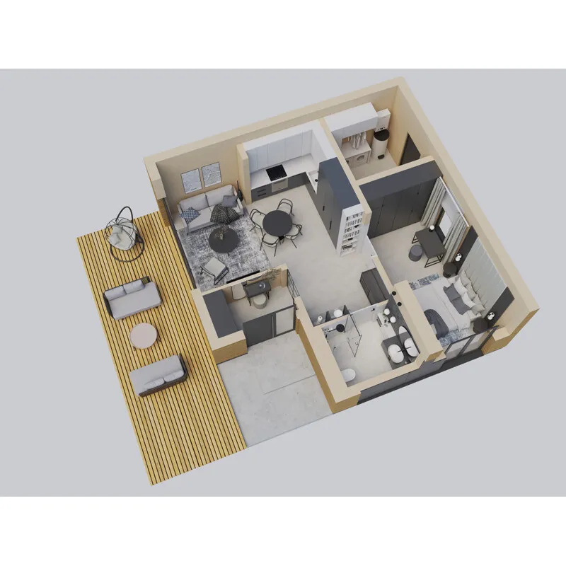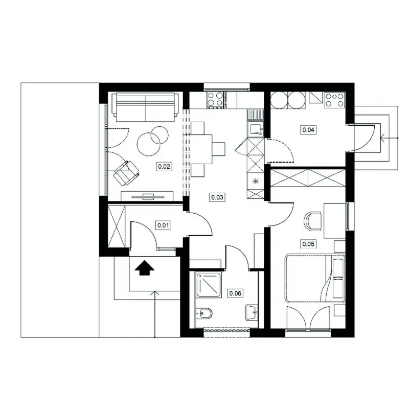 Model A1 was created with a two-person family in mind. It is a minimalist yet modern house with a compact shape, a flat roof, and attics. Its layout is designed to maximize the usable space.