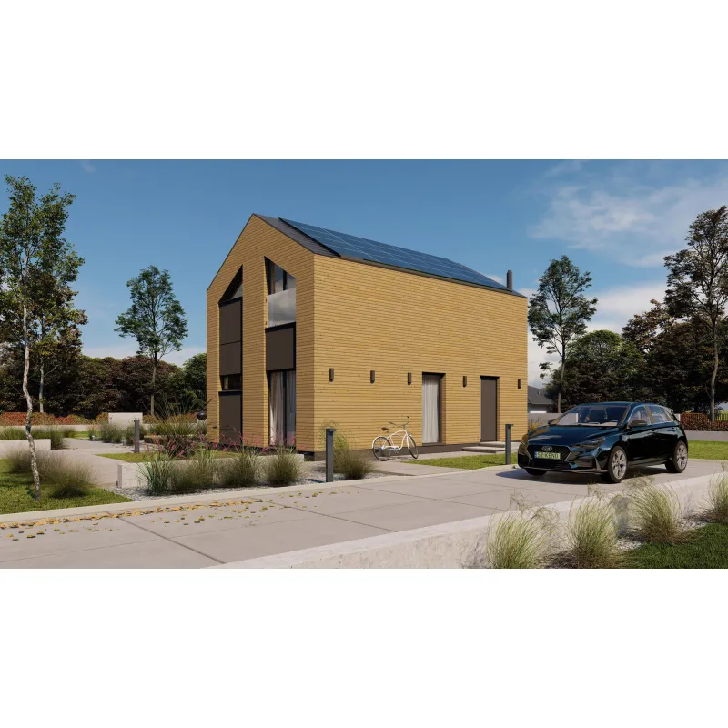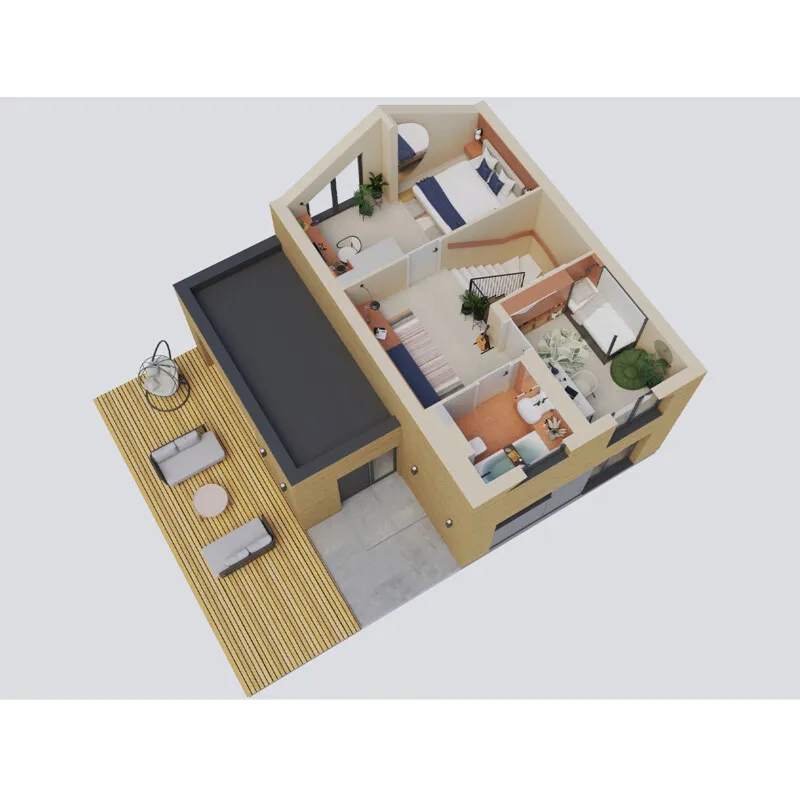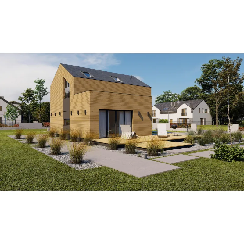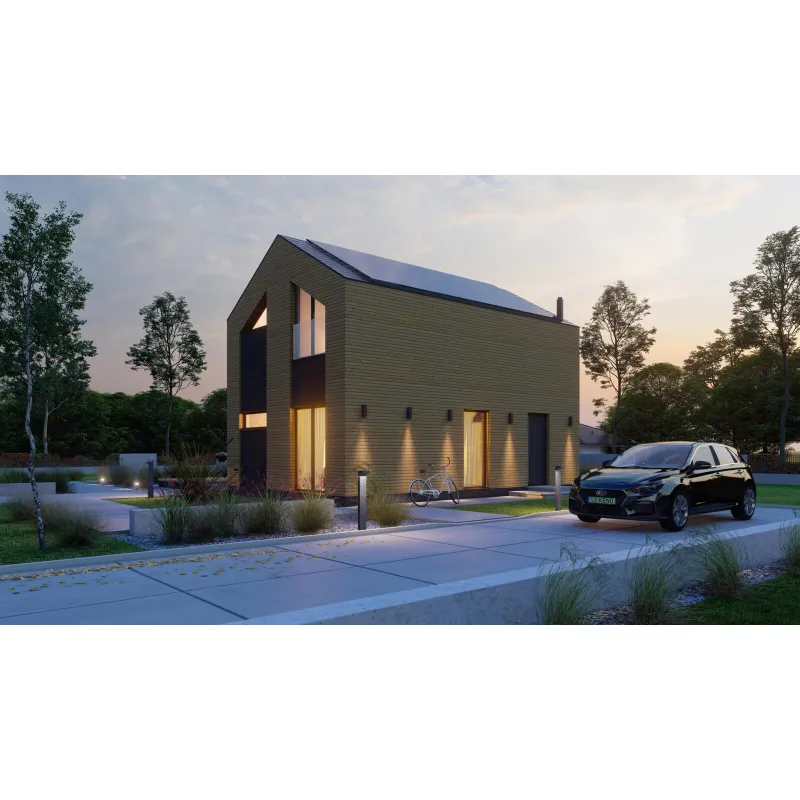 The two-level A2 Dovre modular house of the Polish manufacturer PROSAT Home with a usable area of 80.03 m2 is an ideal choice for people who value ecological solutions and high comfort of use. The house is built of cross-laminated timber panels. The advanced CLT technology is characterized by high strength and beauty of the natural raw material. The A2 model was created for a family of four. It is a modern house with a traditional shape with a gable roof and an attic. Its layout has been designed to maximize the usable space. The process of creating a house is carefully controlled at every stage of production. PROSAT Home houses are compliant with the assumptions of sustainable construction, and the high quality of workmanship is ensured by components from leading European manufacturers.