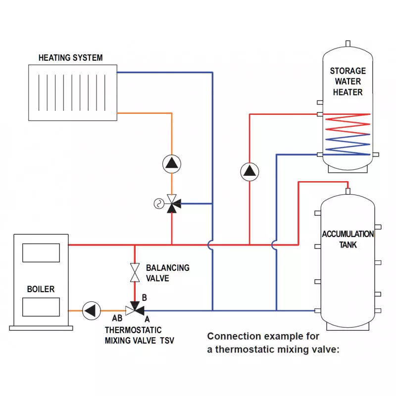The thermostatic mixing valve TSV B mixes cold water returning from the heating system or storage tank with hot water from the boiler outlet, thereby maintaining the return water to the boiler and the heat exchange surface at a temperature where condensation does not occur. It does not require a balancing valve for its function. Its installation is simpler, and regulation is more precise.