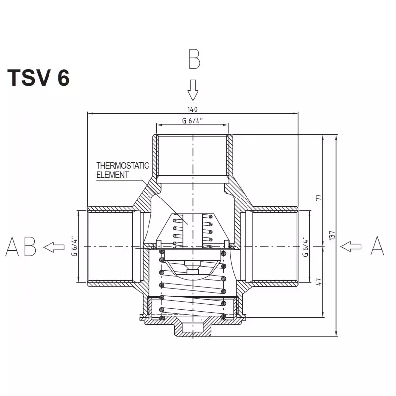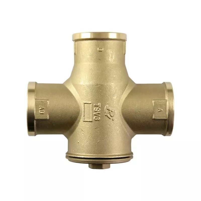 The thermostatic mixing valve TSV B has a built-in thermostatic cartridge that closes the "A" inlet (from the heating system) if the return water to the boiler (outlet "AB") is lower than the nominal temperature. Upon reaching the opening temperature, the thermostat slowly opens the return water inlet "A" from the heating system so that after mixing with hot water from the boiler outlet (inlet "B"), the return water temperature to the boiler (outlet "AB") is slightly higher than the valve opening temperature. At the same time, it gradually closes the "B" inlet, thereby limiting the flow of hot water from the bypass. This eliminates the need for a balancing ball valve.