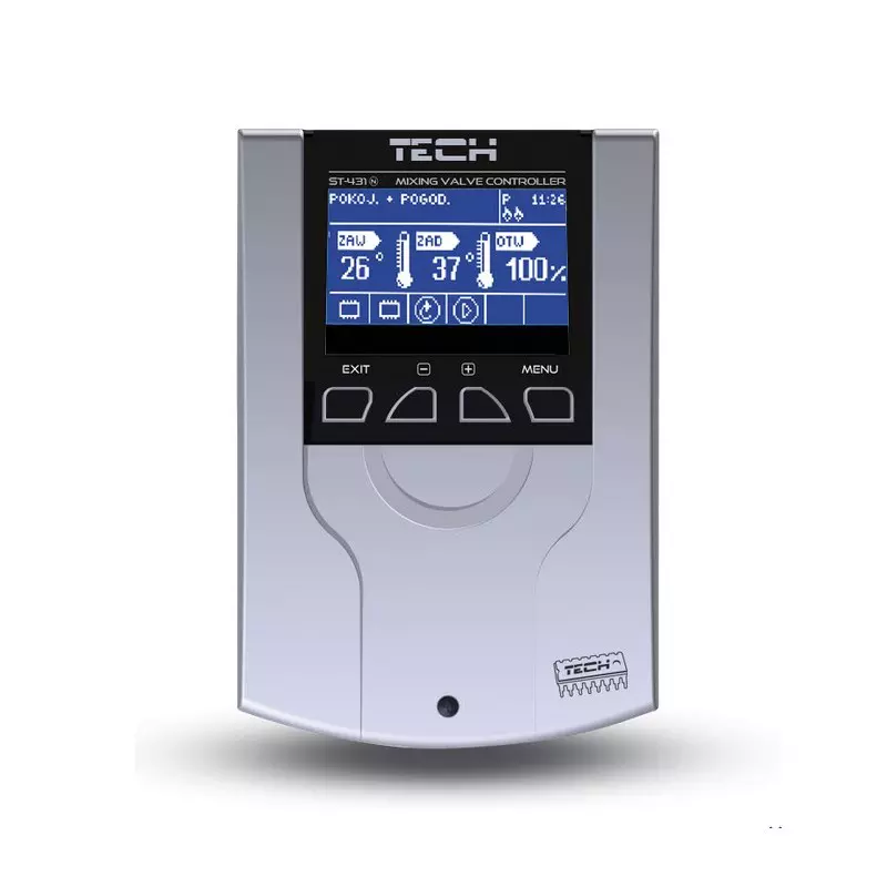 Central heating thermoregulator TECH ST-431N is a controller for 3-way or 4-way mixing valve which can also control a mixing valve pump. The controller ST-431N can be connected to a room thermostat with RS communication (ST-280, ST-298) or internet control module ST-500 as an accessory.