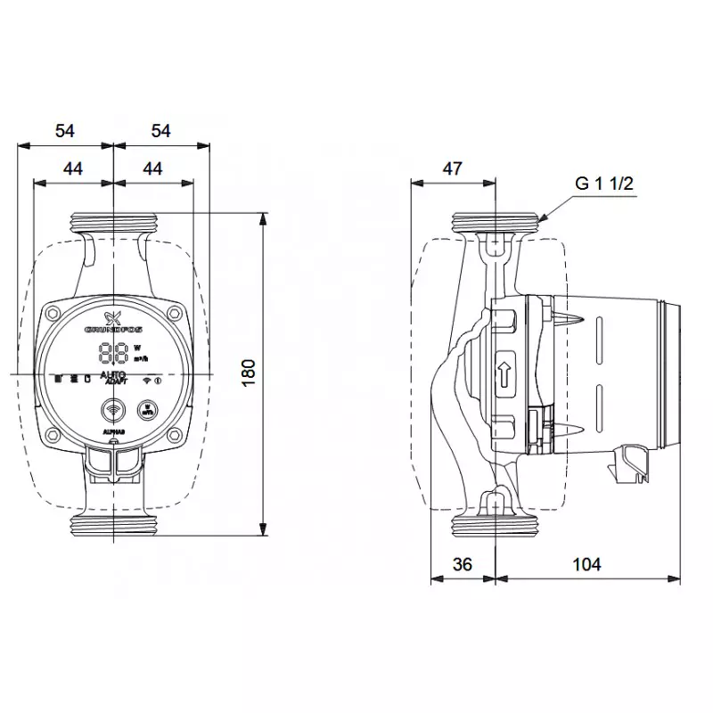 Wyświetlacz pokazuje aktualną wartość poboru mocy w [W] lub aktualną wydajność w [m3/h]. Również wyświetlany jest aktualny rodzaj regulacji pompy. Pompa jest samoodpowietrzająca przez system grzewczy. Pompa i silnik twoją integralną jednostkę bez uszczelniania wału, łożyska są smarowane tłoczoną cieczą, dlatego pompa nie wymaga konserwacji.