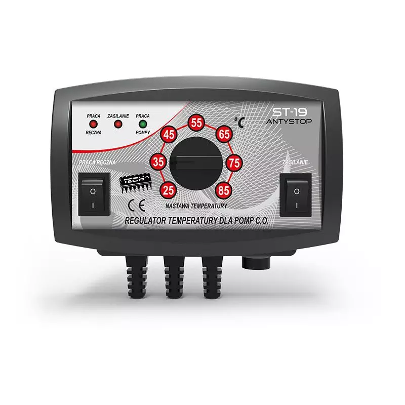 Regulator ST-19 antystop przeznaczony jest do sterowania pompą obiegu wody centralnego ogrzewania. Ustawianie temperatury zadanej dokonujemy za pomocą potencjometru. Zadaniem regulatora jest: załączanie pompy, jeśli temperatura uzyska zadaną wartość, oraz wyłączanie jej - jeśli piec wychłodzi się o 2°C poniżej zadanej. Taki tryb pracy zapobiega niepotrzebnemu działaniu pompy, co pozwala zaoszczędzić energię elektryczną oraz przedłuża żywotność pompy i podnosi jej niezawodność. Sterownik St-19 posiada również dodatkową funkcję ANTYSTOP, która zapobiega zastaniu pompy obiegowej poza sezonem (pompa załącza sie co ok. 10 dni na 1 minutę).