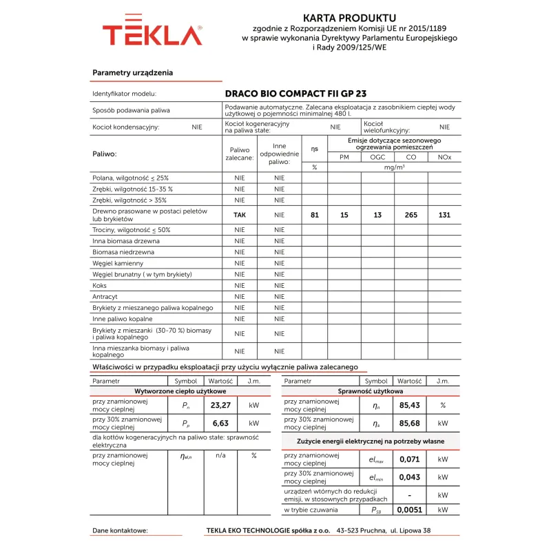 | PARAMETRY TECHNICZNE | J.m. | DRACO BIO COMPACT F II GP 12 | DRACO BIO COMPACT F II GP 18 | DRACO BIO COMPACT F II GP 23 | |