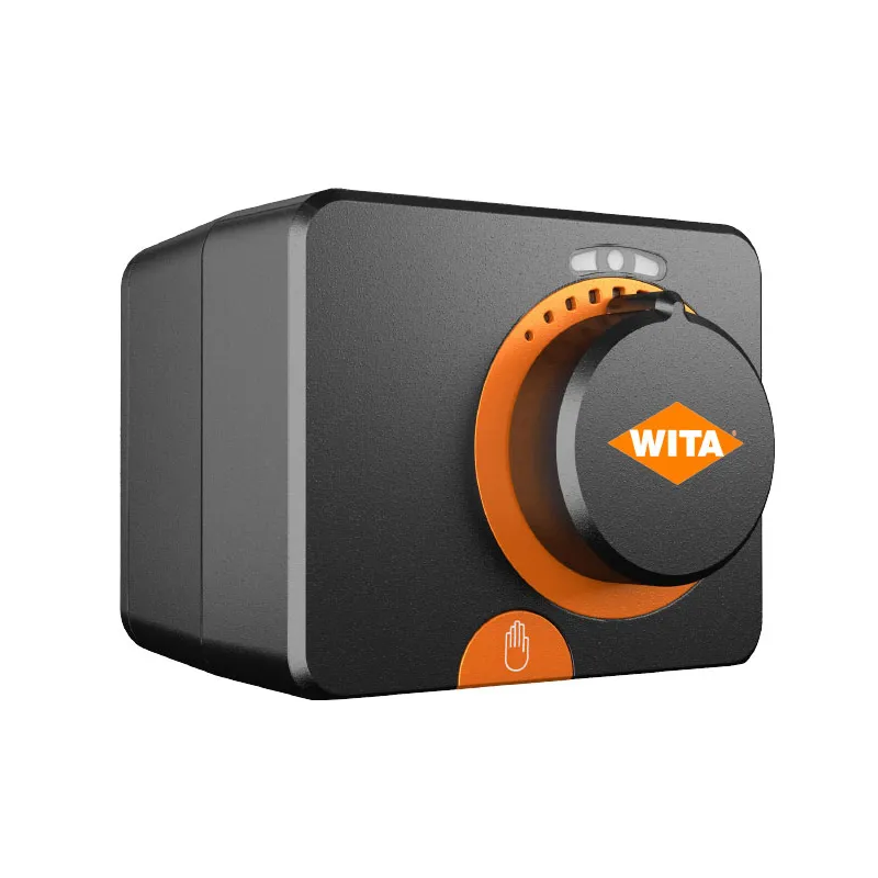 Siłownik elektryczny WITA SM W05 jest stosowany do napędzania obrotowych zaworów mieszających. Dzięki nowoczesnej konstrukcji i doskonałej jakości zastosowanych materiałów zapewnia niezawodną i cichą pracę. Montaż i demontaż do zaworu odbywa się bez narzędzi – wystarczy nacisnąć przycisk. Sprzęgło do przestawiania ręcznego aktywuje się i dezaktywuje po naciśnięciu przycisku odblokowującego. Praca siłownika jest sygnalizowana przez diody LED. Następca modelu SM 4.6 i SM 44.6.