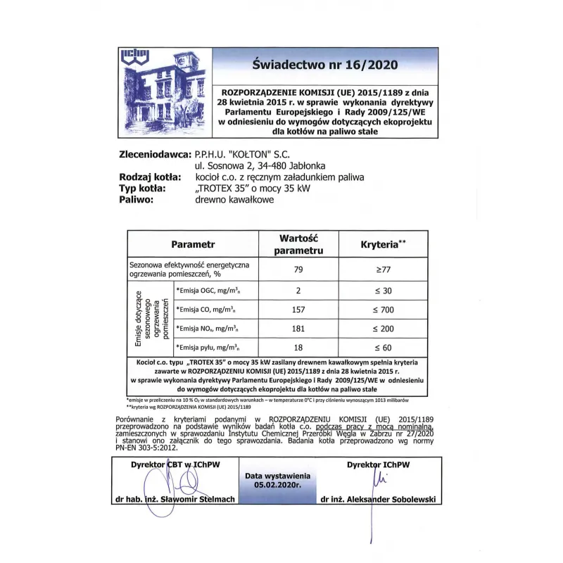 Kocioł KOŁTON TROTEX posiada certyfikat ecodesign oraz certyfikat 5 klasy. Przeznaczony jest do zasilania instalacji centralnego ogrzewania oraz przygotowania ciepłej wody użytkowej. Kocioł zgazowujący KOŁTON TROTEX przystosowany jest do spalania drewna kawałkowego metodą zgazowania (dolne spalanie). Poszczególne elementy kotła wykonane są z blach 6- 10mm. Wymiennik kotła skonstruowano z pionowych paneli. Komora spalania posiada ruszt żeliwny, ceramiczne wyłożenie oraz dysze napowietrzające. Spaliny z komory paleniskowej przechodzą dołem, przez specjalnie opracowaną kształtkę, pomiędzy ścianką dzielącą palenisko do tylnych pionowych kanałów gdzie przy nawrocie spalin następuje częściowe wytrącenie pyłów i sadzy.