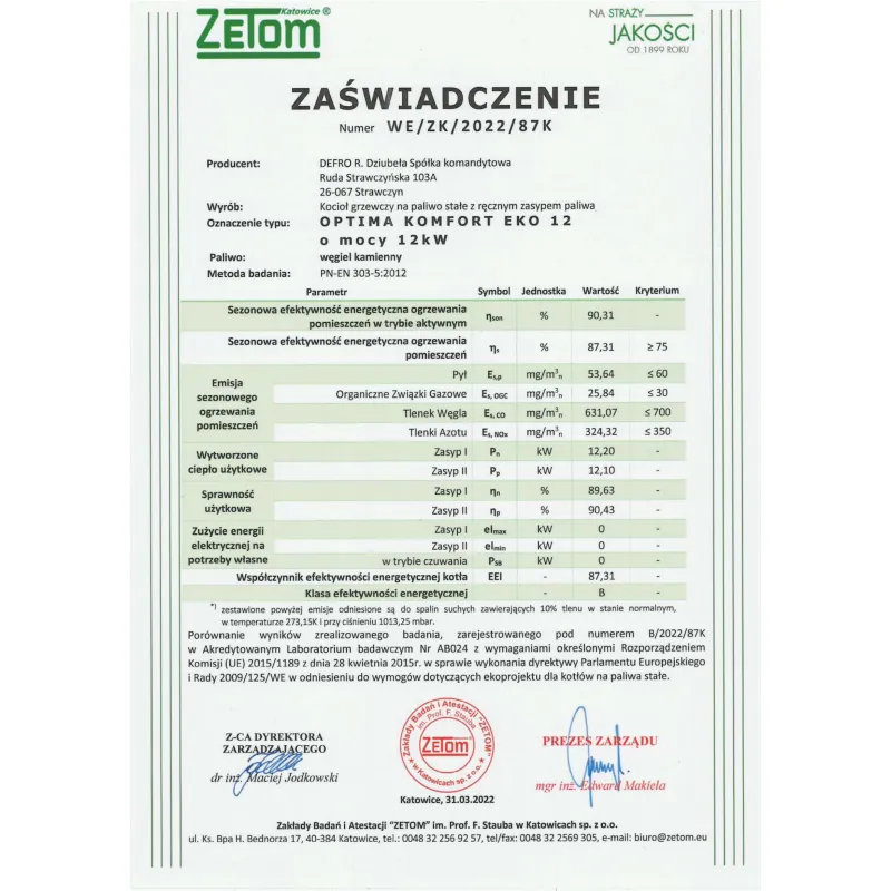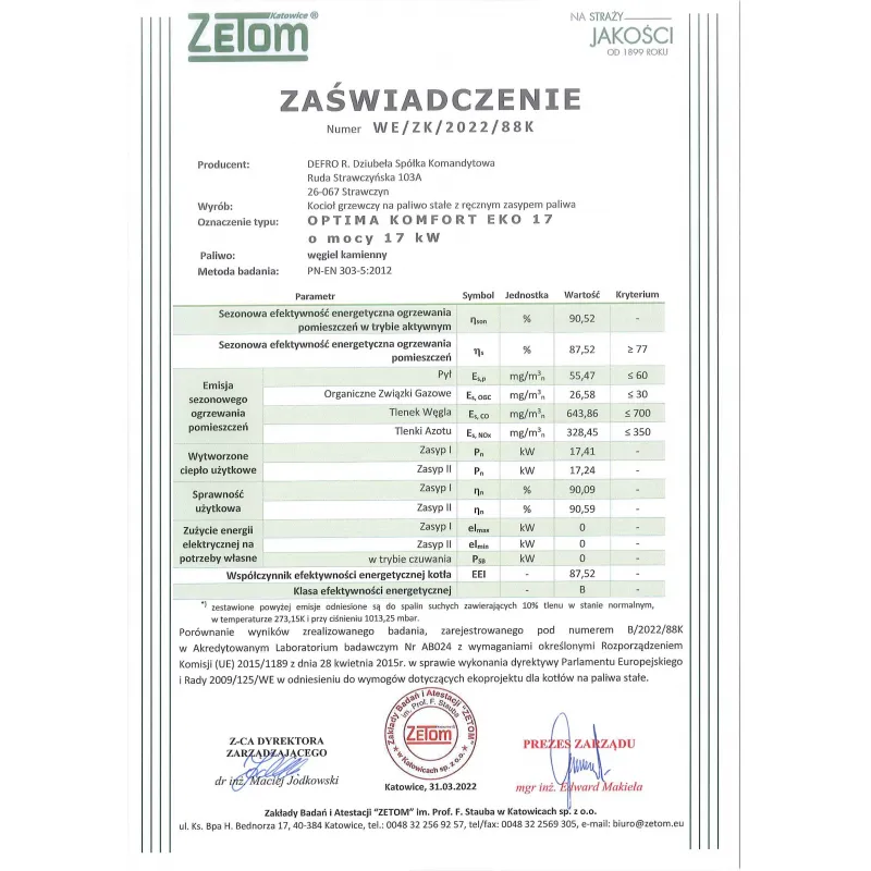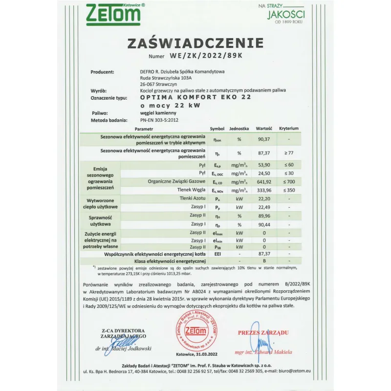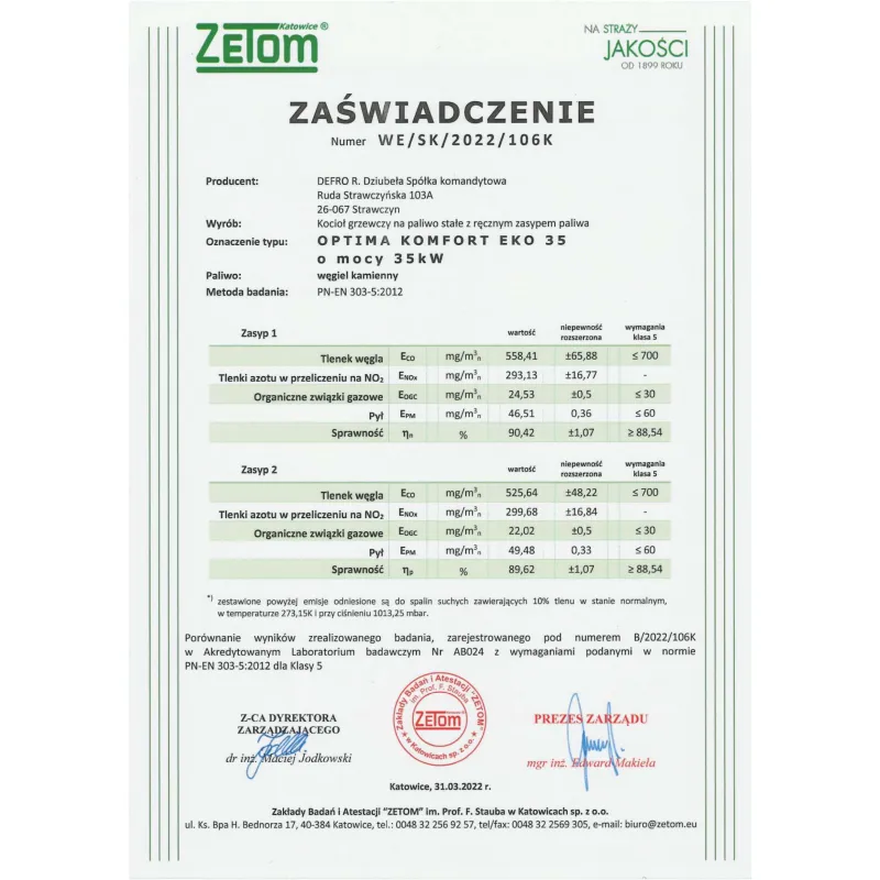 Kotły spełniają wymagania energetyczno-emisyjne klasy 5 oraz posiadają Certyfikat Ecodesign.