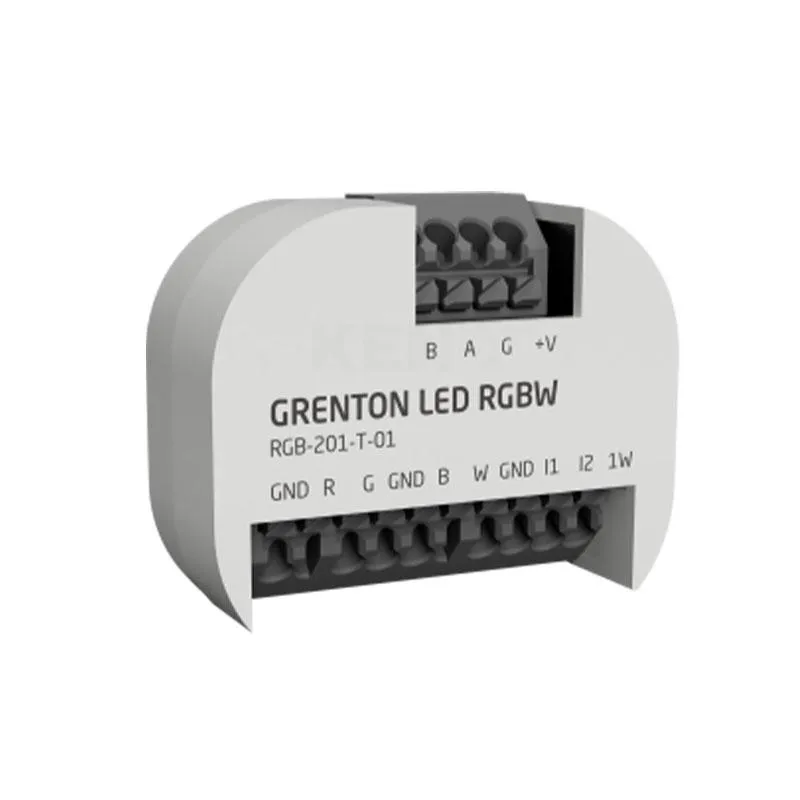 Moduł ściemniający LED RGBW Grenton umożliwia płynne i pełne sterowanie oświetleniem LED, oświetleniem halogenowym wykorzystującym sygnał PWM. Moduł może pełnić rolę kontrolera oświetlenia typu LED RGBW oraz pracować jako czterokanałowy ściemniacz oświetlenia LED. Pozwala na podłączenie do systemu 2 wejść cyfrowych oraz do 2 czujników temperatury po 1-Wire. Umożliwia płynne ściemnianie oraz zmianę barwy oświetlenia LED. Może pracować jako 4-kanałowy ściemniacz oświetlenia LED DC. Umożliwia na podłączenie oświetlenia sterowanego sygnałem PWM. Dwa wejścia cyfrowe, które umożliwiają podłączenie np. 2 standardowych włączników. Umożliwia podłączenie 2 czujników temperatury.