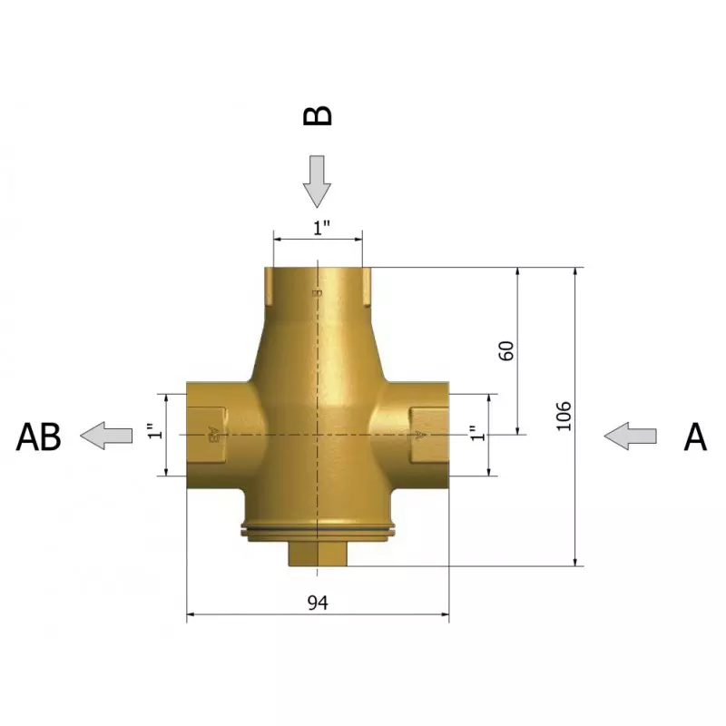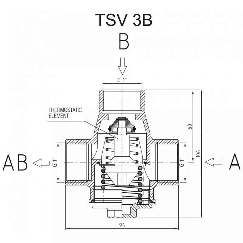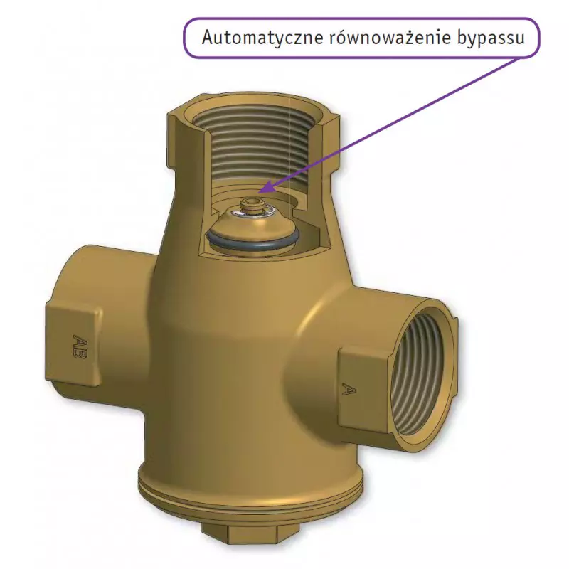 Termostatyczny zawór mieszający TSV B posiada wbudowaną wkładkę termostatyczną, która zamyka dopływ „A” (z instalacji grzewczej), jeśli woda powrotna do kotła (wyjście „AB”) jest niższa niż temp. nominalna. Po osiągnięciu temperatury otwarcia termostat powoli otwiera wlot wody powrotnej „A” z instalacji grzewczej tak, aby po zmieszaniu z ciepłą wodą z wylotu kotła (wlot „B”) temperatura wody powrotnej do kotła (wylot „AB”) była nieco wyższą niż temperatura otwarcia zaworu. Jednocześnie stopniowo zamyka dopływ „B” ograniczając tym samym dopływ ciepłej wody z obejścia. Eliminuje to potrzebę stosowania zaworu równoważącego kulowego.