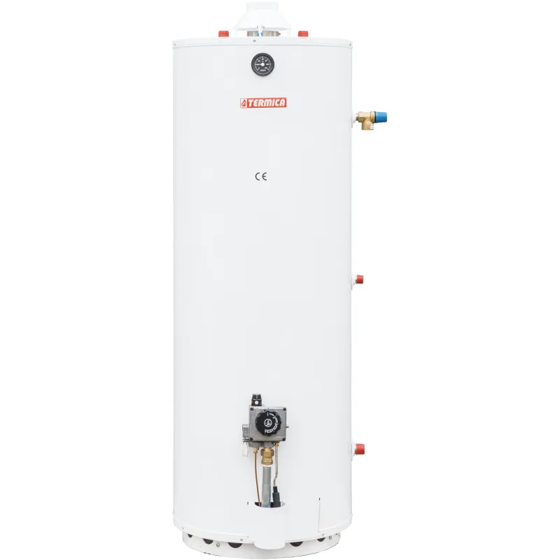 Pojemnościowe stojace podgrzewacze gazowe TERMICA P, wykonane ze stali nierdzewnej z izolacją i metalową obudową. Bezpieczeństwo eksploatacji zapewnia automatyka sterująco- regulująca wyposażona w urządzenie odcinające dopływa gazu w przypadku zgaśnięcia płomienia na palniku. Urządzenie wyposażone jest również w czujnik zaniku ciągu kominowego z limiterem uniemożliwiającym zagotowanie się wody w podgrzewaczu. W podgrzewaczu znajduje się również fabrycznie montowany zawór bezpieczeństwa. Urządzenie jest niewrażliwe na spadki ciśnienia wody. Ciepło ogrzewające wodą pochodzi ze spalania gazu ziemnego. Gdy zapotrzebowanie na wodę jest większe niż pojemność pojedynczego podgrzewacza mogą one być łączone szeregowo w bateria, zapewniając dostateczną ilości ciepłej wody.