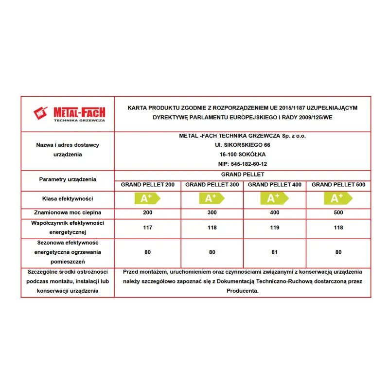 | Zakres mocy kotła | [m2] | 90 - 300 |