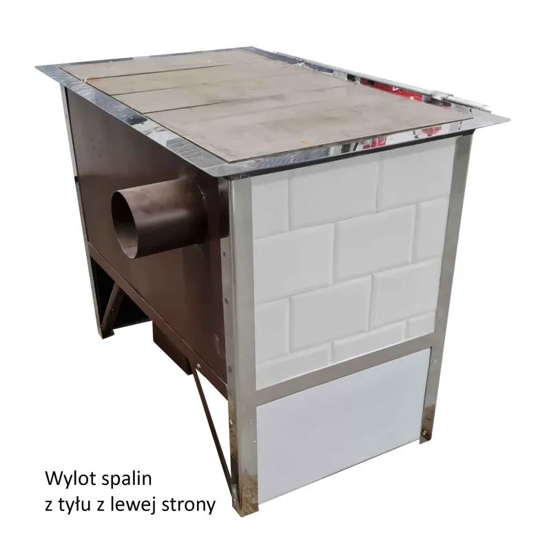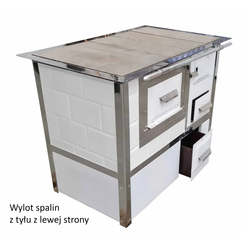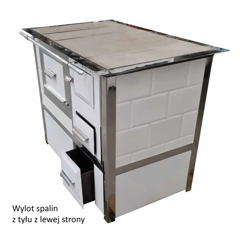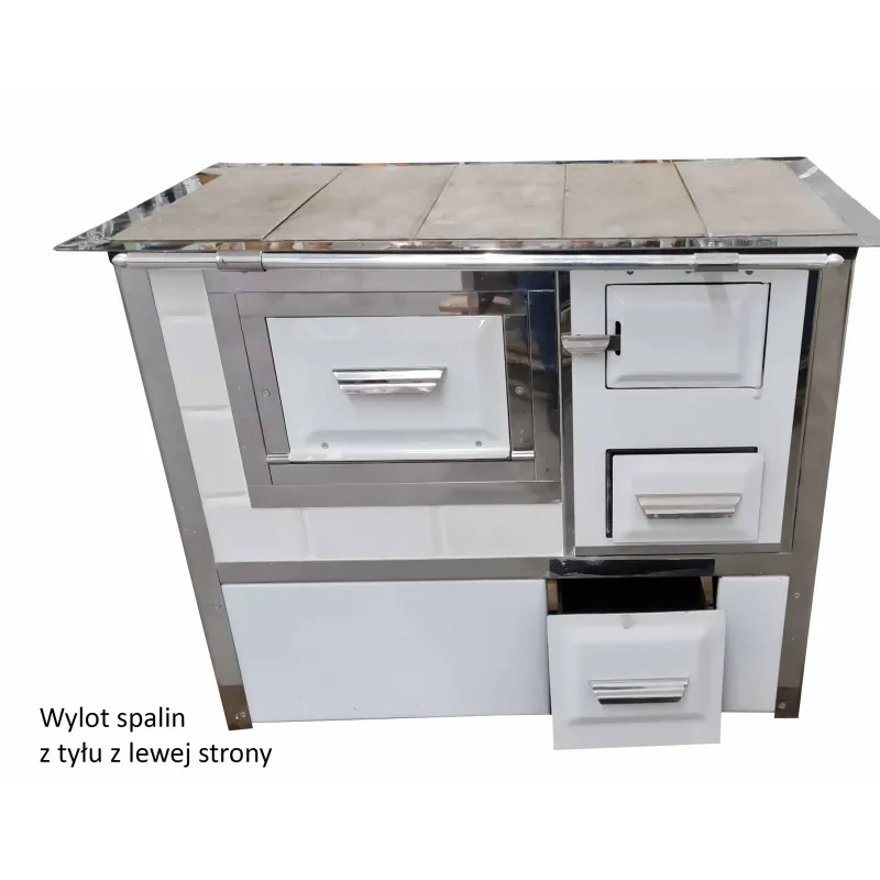 W przedniej ściance znajdują się drzwiczki paleniska i piekarnika, a równomierne nagrzanie grzejnika zapewnia kanał grzewczy. Kuchnia została zaprojektowana z wysokiej jakości materiałów: niklowana konstrukcja, emaliowane drzwiczki, ściany wyłożone kaflami oraz nierdzewna rama wokół płyty. Dodatkowo, palenisko i cała kuchnia wyłożone są cegłą szamotową, co zwiększa trwałość i efektywność cieplną urządzenia.