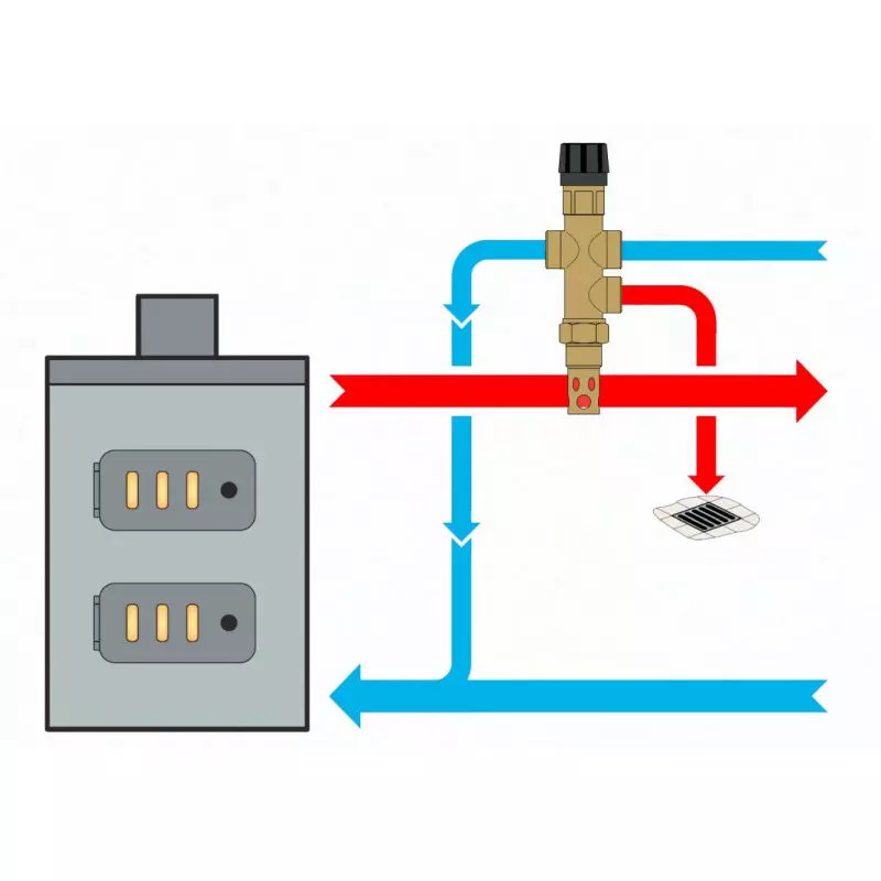 Zawór termostatyczny służy do schłodzenia kotła na paliwo stałe, bez schładzającego wymiennika ciepła. Zawór wyposażony jest w dwa poziomy dolny i górny. Dolny poziom ma za zadanie odprowadzenie gorącej wody z kotła, natomiast górny ma za zadanie wprowadzenie zimnej wody do źródła ciepła czyli do kotła w celu jego schłodzenia. Gdy temperatura osiągnie temperaturę otwarcia zostają otwarte oba poziomy jednocześnie. Dolny odprowadza gorąca wodę do kanalizacji, a górny uzupełnia ubytek woda zimną, powoduje to zrównoważenie ciśnienia w systemie.