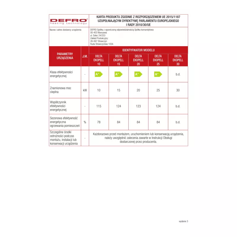 Nazwa kotła | Defro Delta EkoPell | |||||