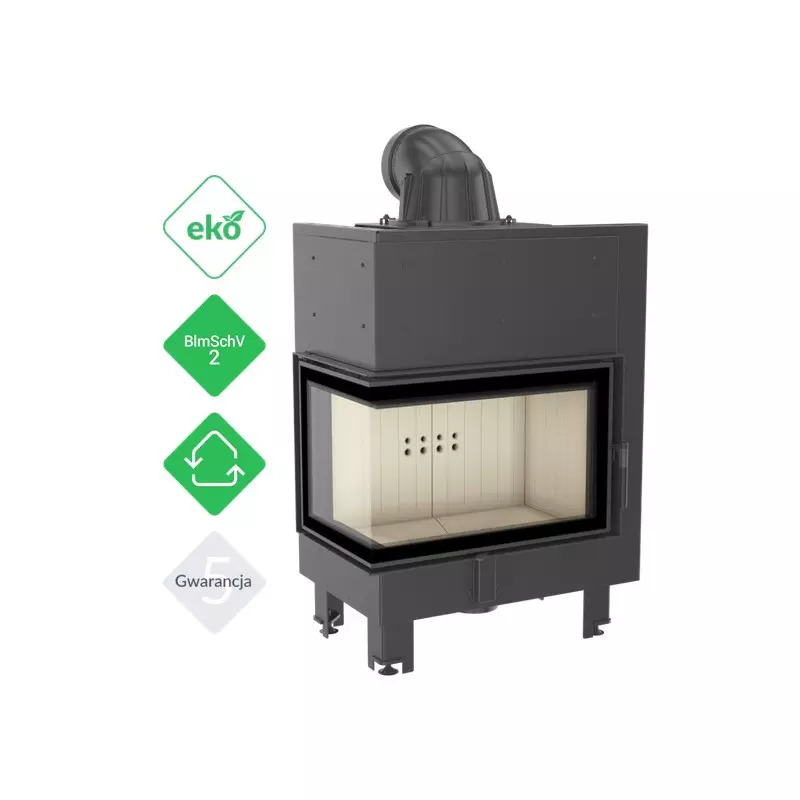 Wkład kominkowy wykonany z wysoko gatunkowej stali. Stalowe elementy zostały wycięte laserowo, a następnie wygięte na giętarkach CNC. Front wkładu wyposażony został w ceramikę żaroodporną wytrzymująca temperaturę do 800°C.
