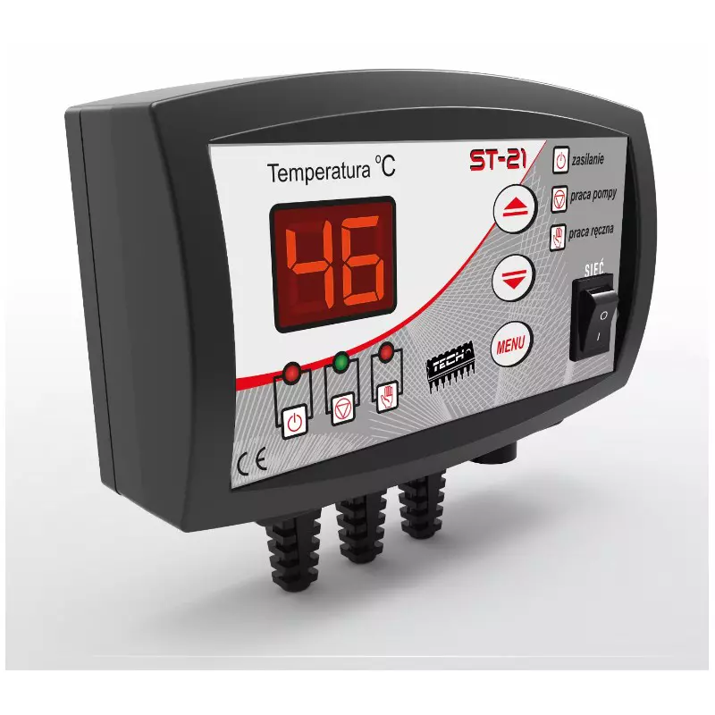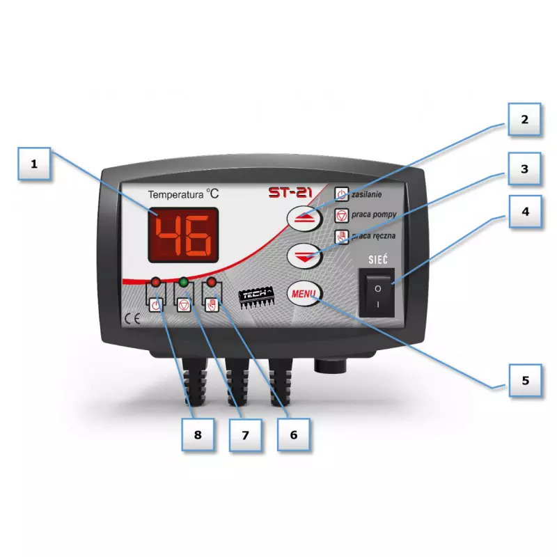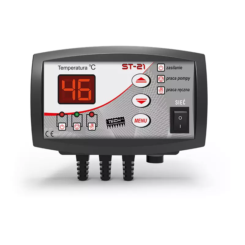 Regulator temperatury instalacji c.o TECH ST-21 z wyświetlaczem LED to sterownik pompy przeznaczony do sterowania pompą obiegu wody w instalacji centralnego ogrzewania.